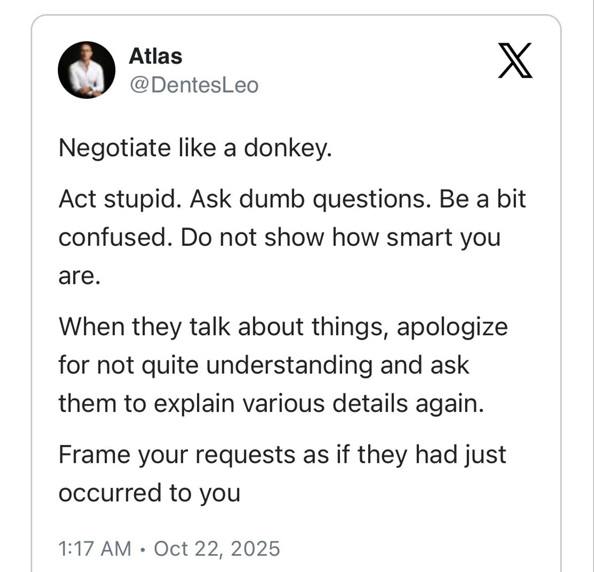 "Negotiate like a donkey. Act stupid. Ask dumb questions. Be a bit confused."